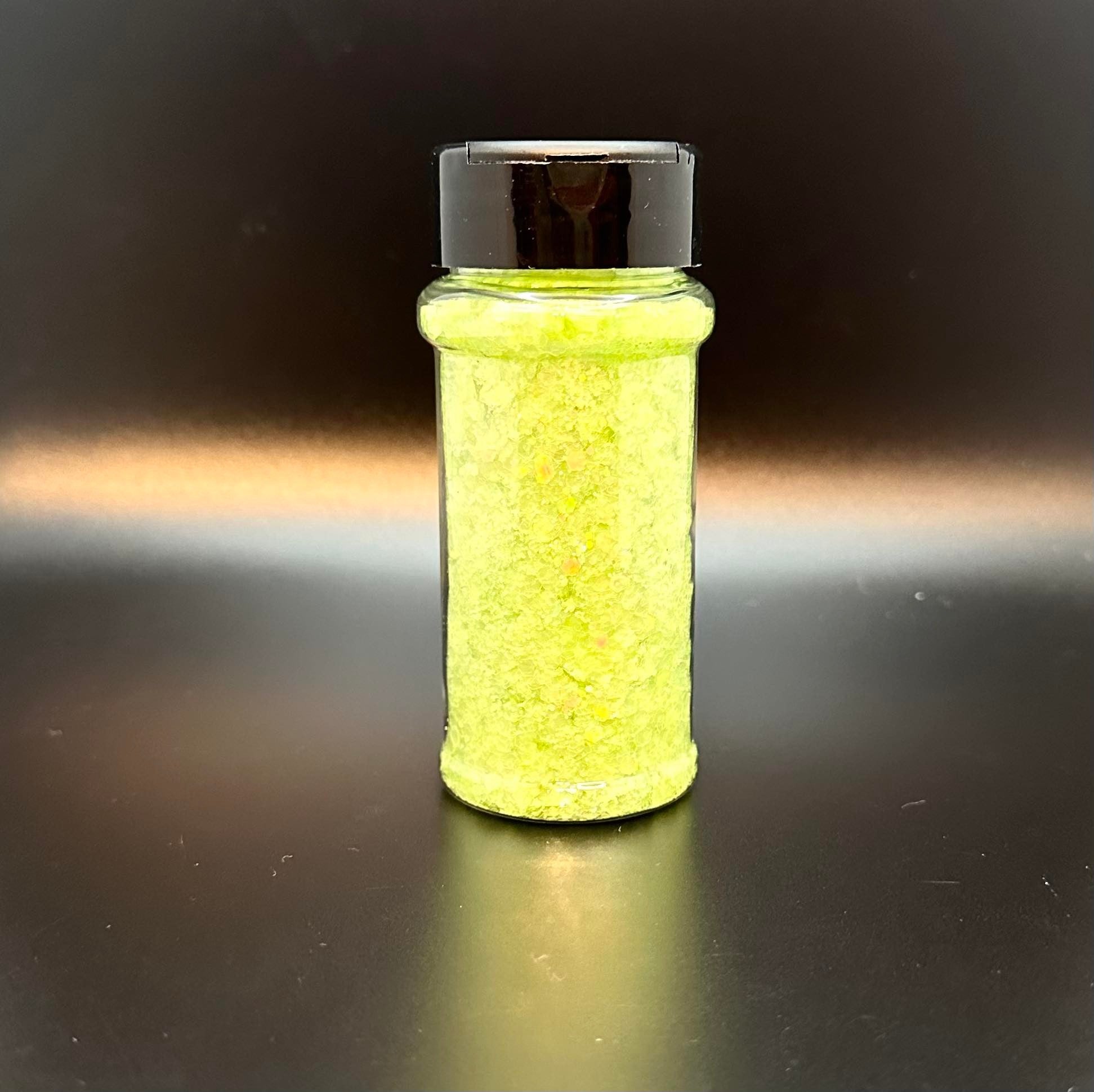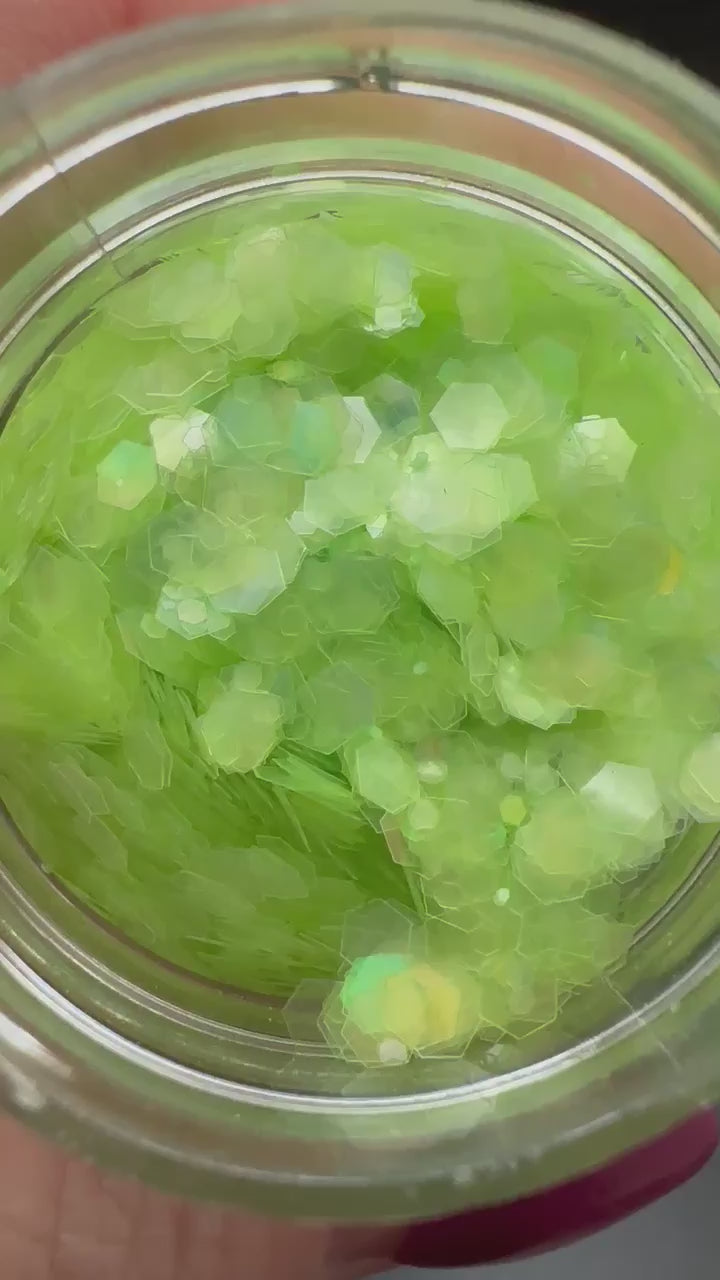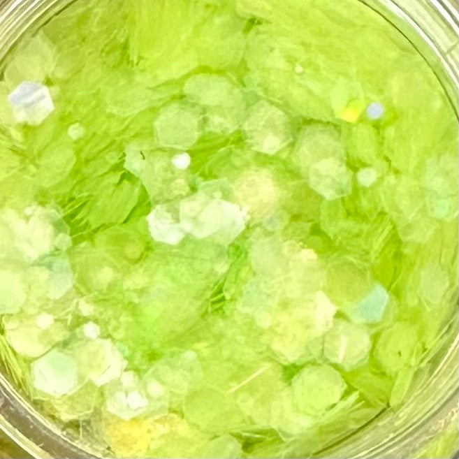 Sheer bright green chunky mix glitter with a holographic iridescence.