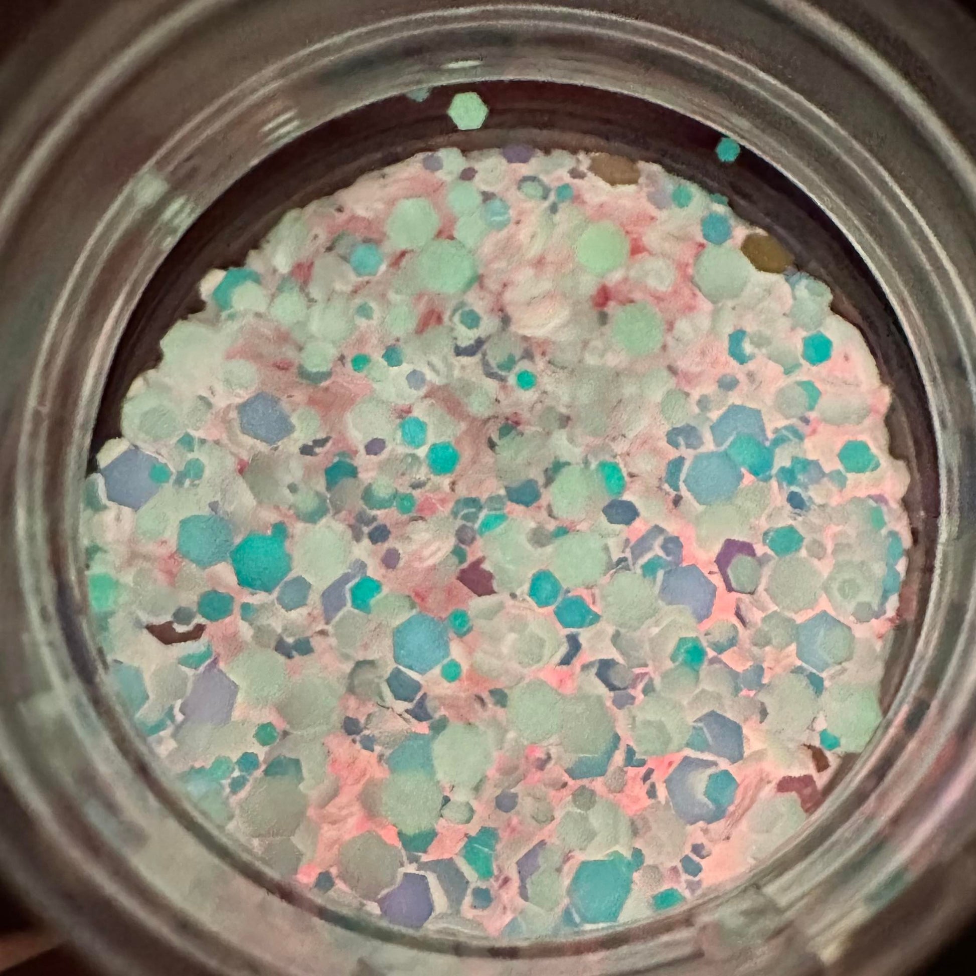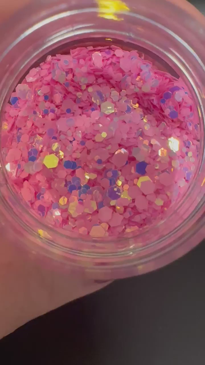 Light pink colored glitter with a gold/purple shift chunky mix that glows after charged with light.