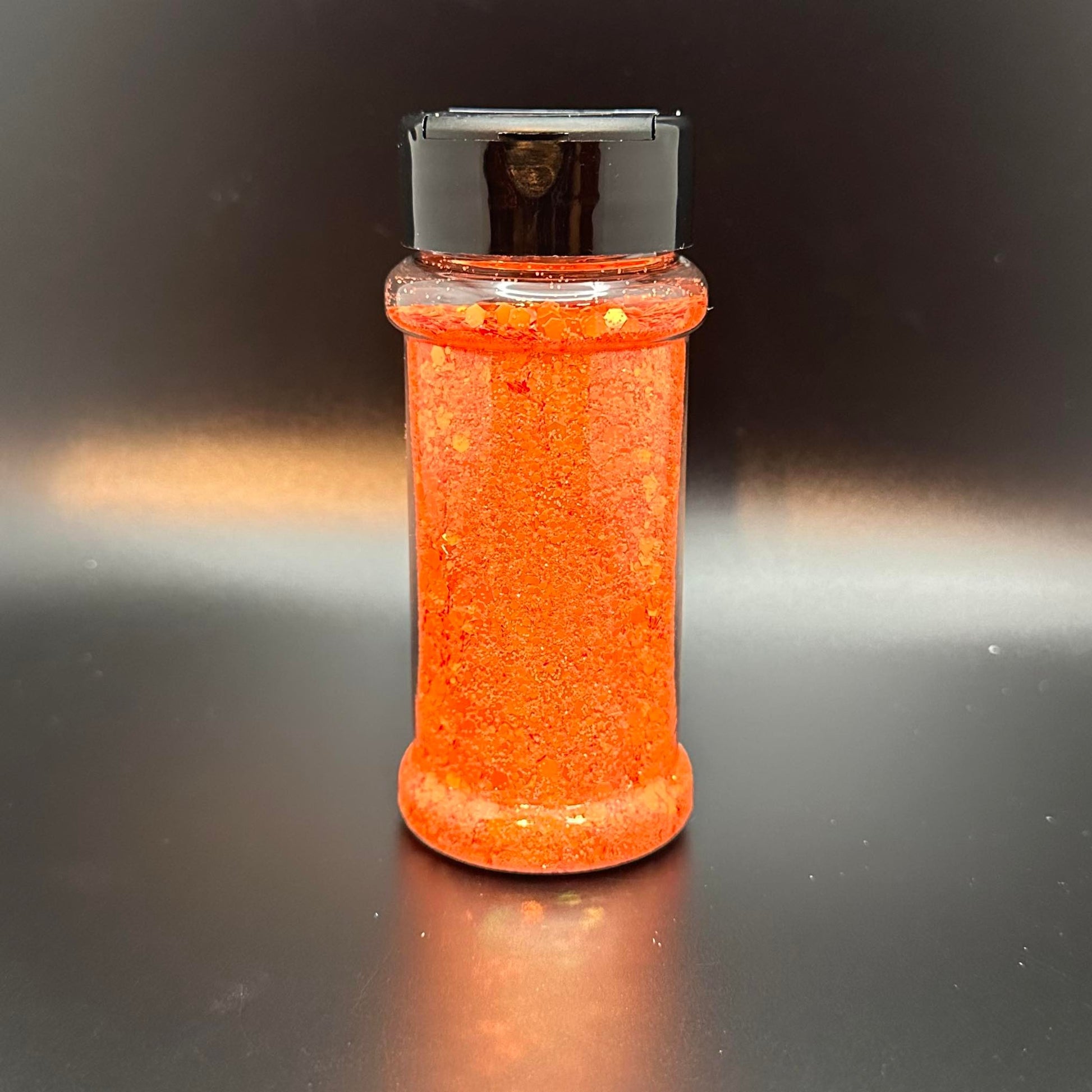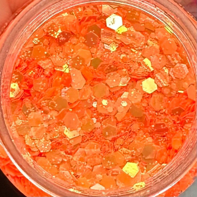 Orange glitter with a gold shift chunky mix that glows after exposure from light.