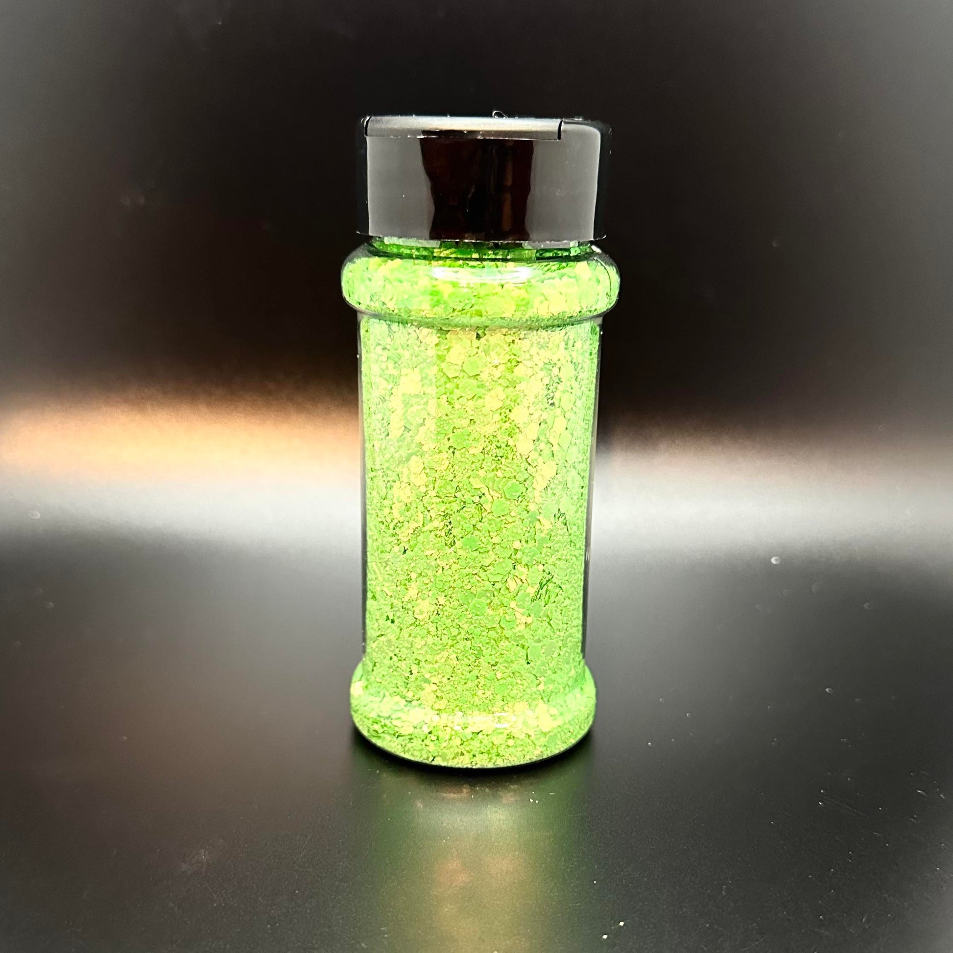 Green glitter with a gold shift chunky mix that glows after exposure from light.