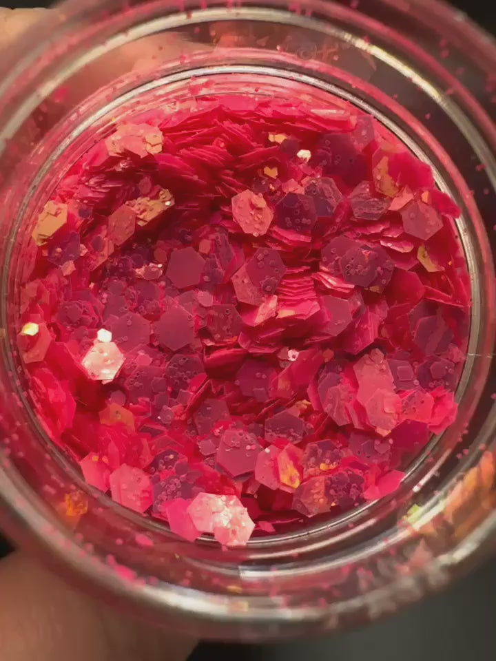 Hot pink colored glitter with a gold shift chunky mix that glows after exposure from light.