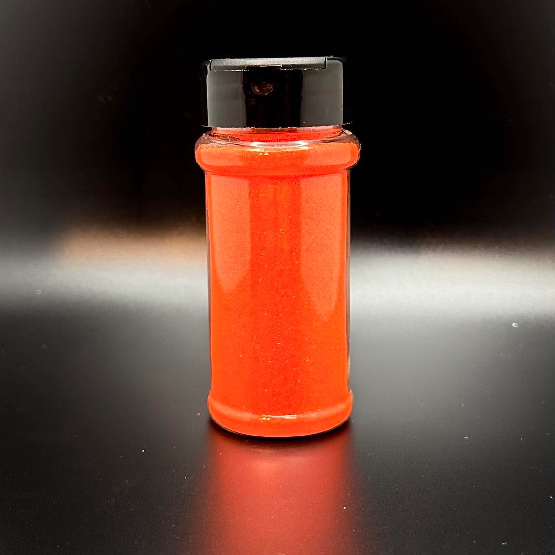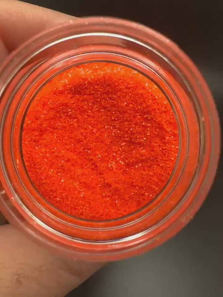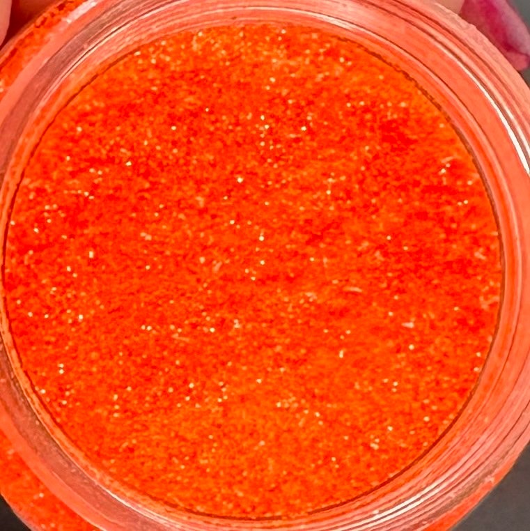 Bright orange glitter with metallic sparkle. Will glow in the dark after exposure to light.