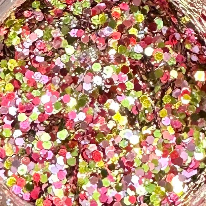 Dark pink and lime green mixed glitter with metallic sparkle.