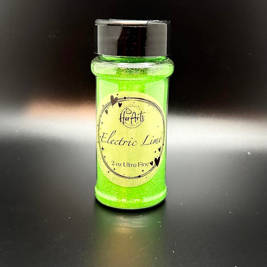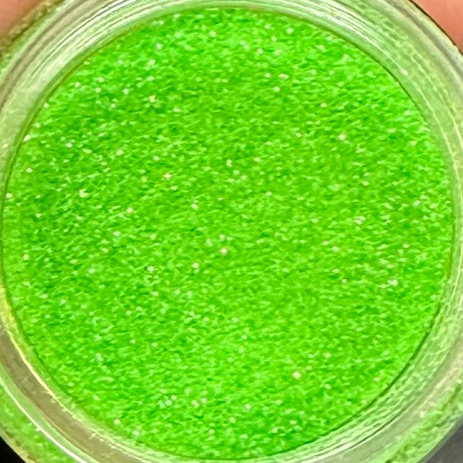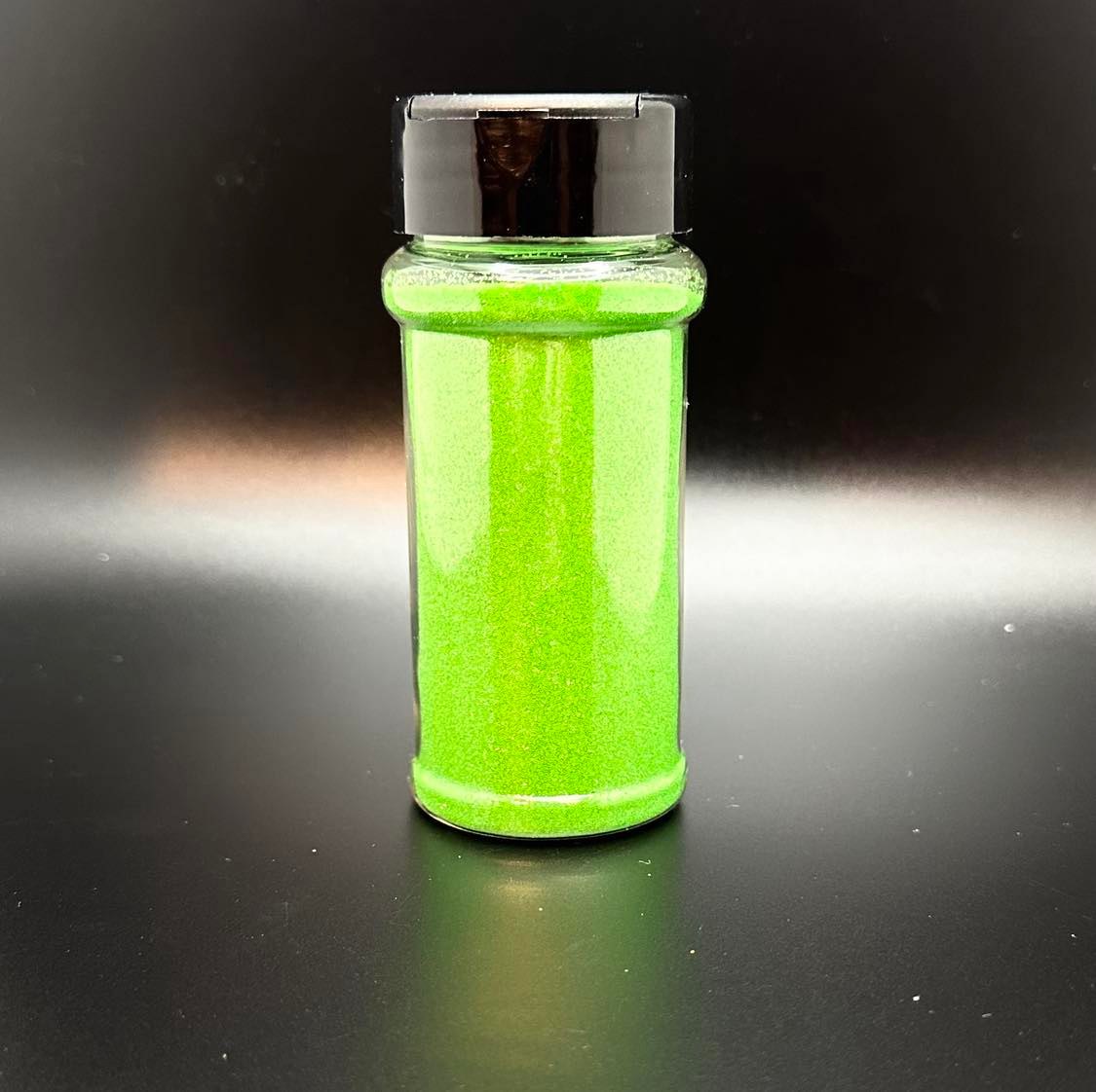 Lime green glitter with metallic sparkle. Will glow in the dark after exposure to light.