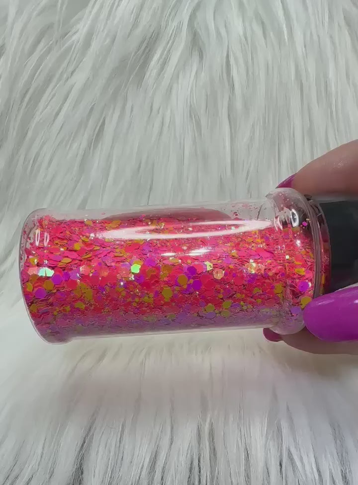 Coral colored glitter with a golden yellow/fuchsia mix.