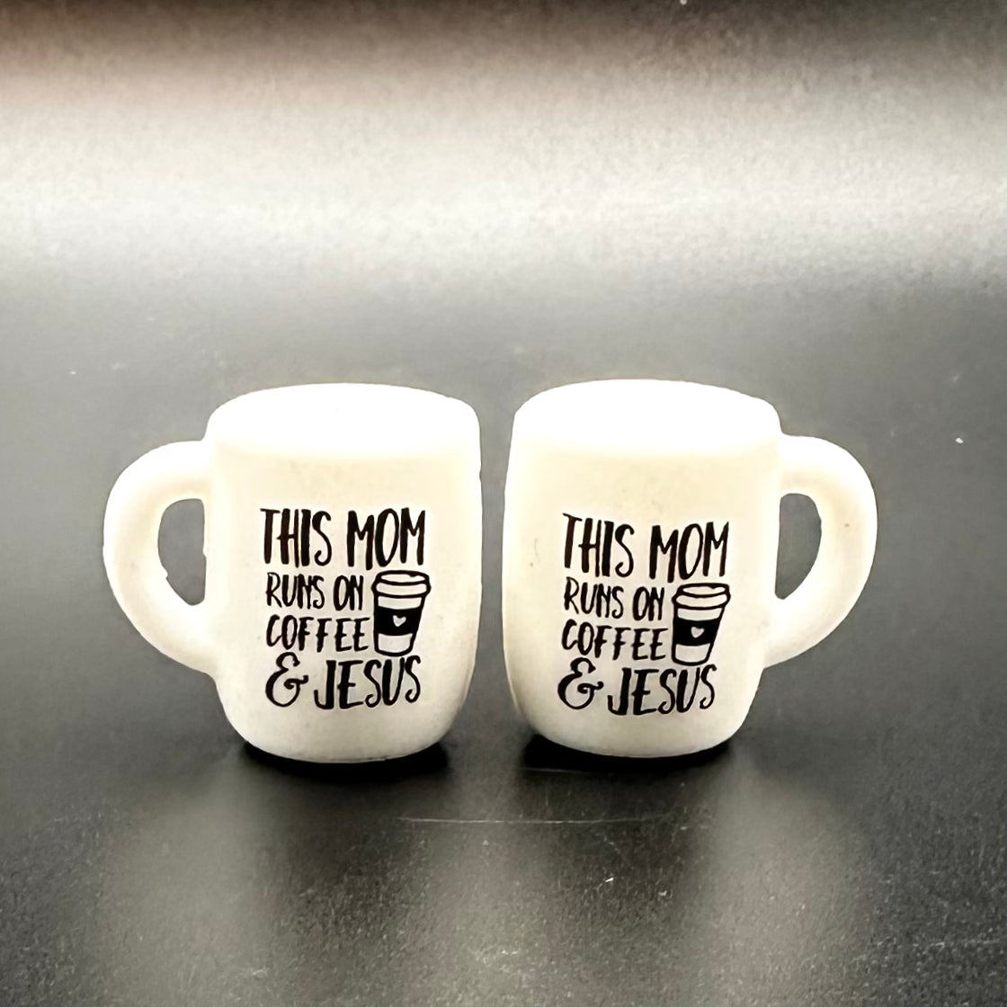 Focal Bead, Silicone Coffee Cup Bead, This Mom Runs on Coffee and Jesus