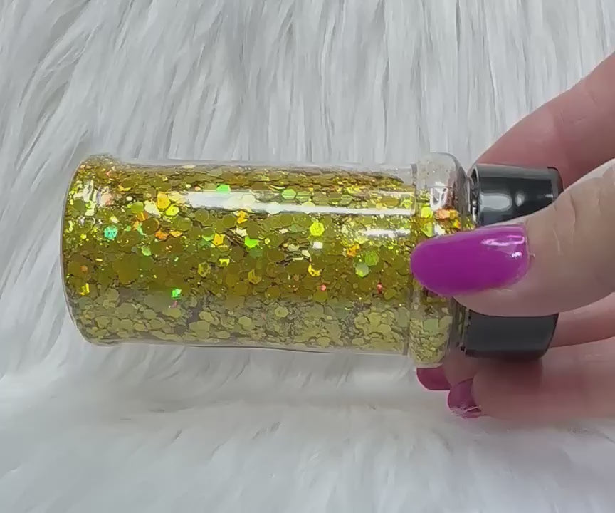 Yellow gold glitter with a yellow/orange/green holographic sparkle.