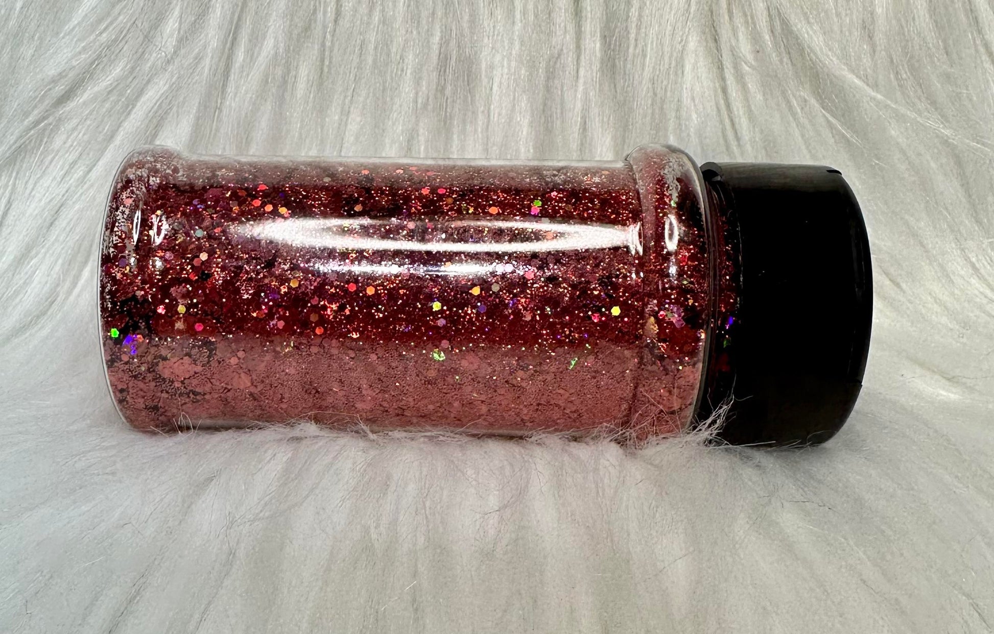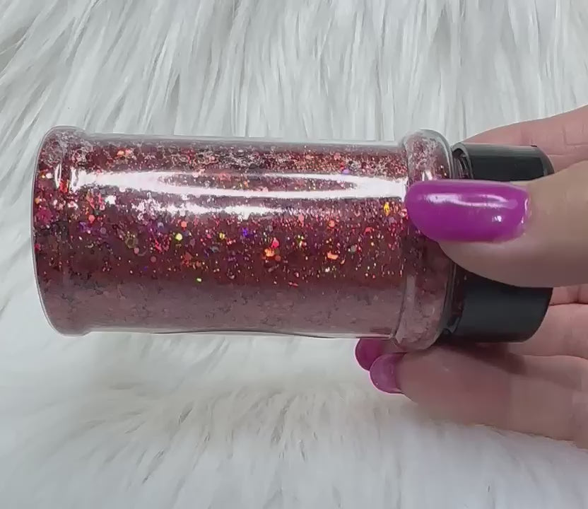 Maroon glitter with a rainbow holographic sparkle.