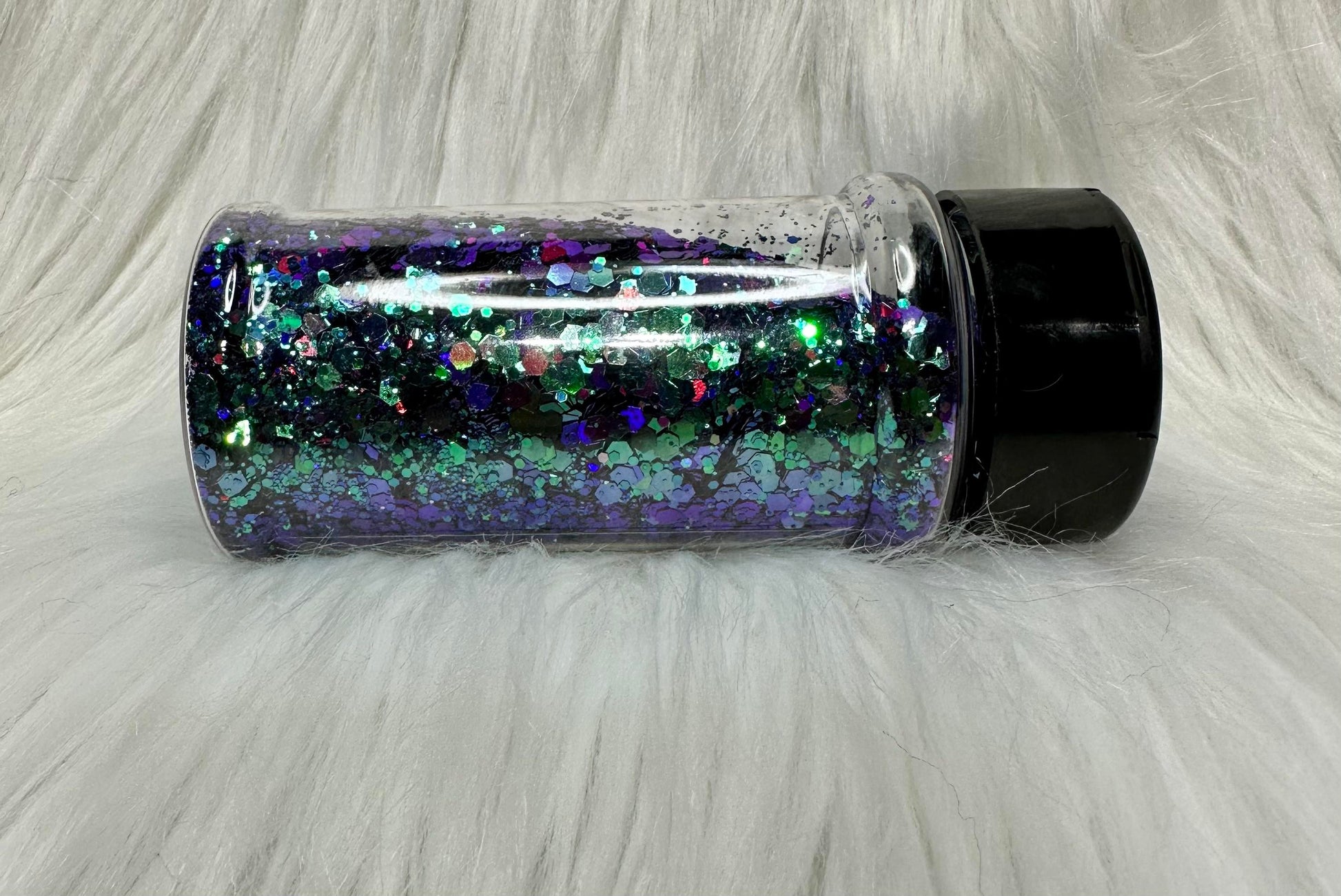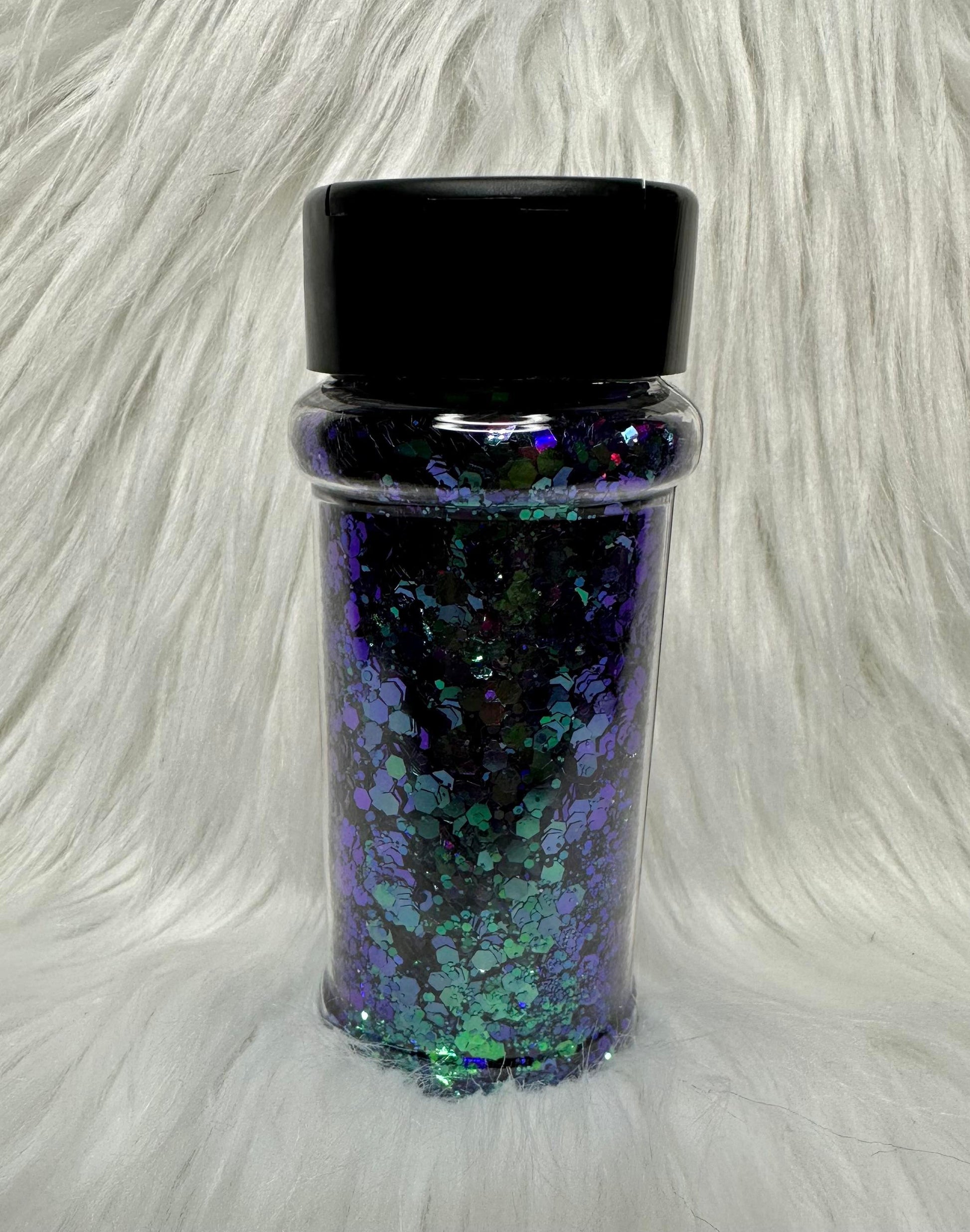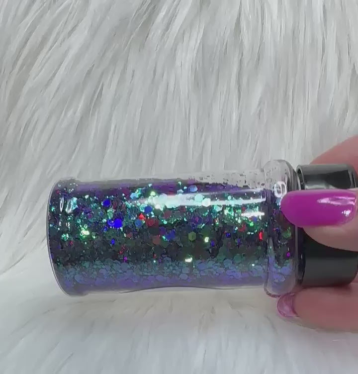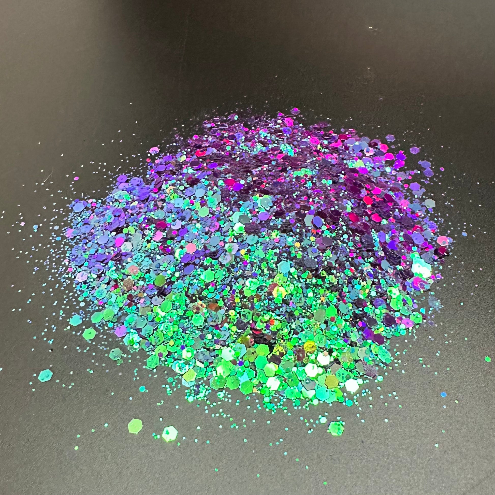 Teal to green chameleon glitter with hints of raspberry and blue.